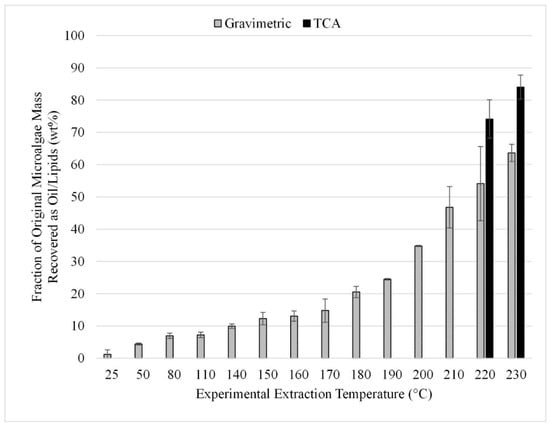 The results presented utilized TCA and gravimetric analytical methods. For comparison, results from the highest recovery case which used grinding at 500 rpm, a microalgae-to-solvent ratio of 1:10, and a temperature of 230 °C were analyzed by GC-FID in addition to the gravimetric and TCA methods. It was observed that the TCA reported the highest overall lipid recovery at 84 wt% with the GC-FID reporting the lowest recovery at 36 wt%. This large disparity is attributed to the inability of the GC-FID method to quantify non-esterifiable lipids. This agrees with previous work, which found approximately half of all lipids within Chlorella vulgaris algae samples to be non-esterifiable, using similar solvents [31]. The gravimetric results from this same sample yield a lipid recovery of 64 wt%, which lies between the GC-FID and TCA recoveries. Gravimetric results, although not identical to the TCA, provided adequate insight into data trends and were considered as a useful method to quickly evaluate lipid extraction experiments.