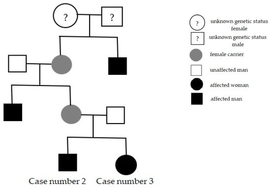 Family pedigree presentation, in which the last subjects are our patients (Cases number two and three).