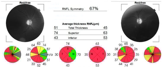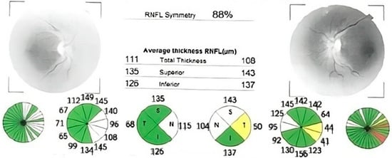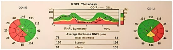 OCT report confirming thinning of nerve fibers layer in temporal sector. White color indicates thicker RNFL.