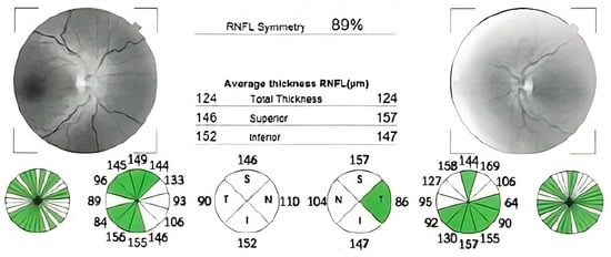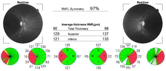 OCT report after 3 months of treatment, showing reduced RNFL edema compared to the moment of diagnosis. The left eye report shows the beginning of temporal atrophy.