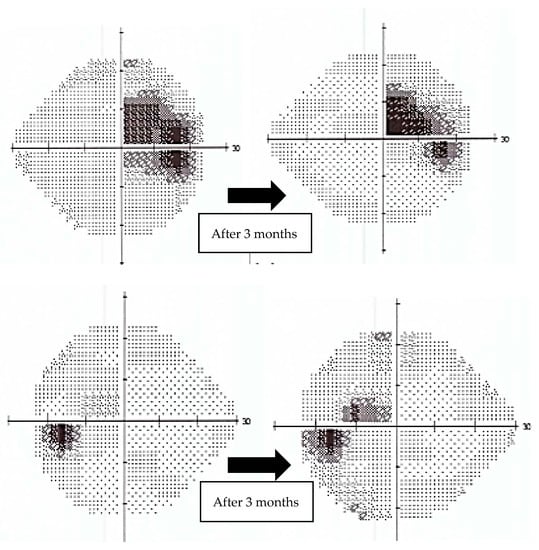 In contrast, case number three exhibited a remarkable increase in visual acuity. (0.2 logMAR vs. 0.5 logMAR at baseline in right eye and 0 logMAR vs. 0.1 logMAR at baseline in left eye), with a positive trend in mean deviation (MD) on 24-2 Humphrey VF (right eye: MD −6.65 dB, p < 0.5%—at diagnosis vs. −4.13 dB, p < 0.5%—after 3 months of Idebenone; left eye: MD −4.37 dB, p < 0.5%—at diagnosis vs. −1.85 dB, p < 0.5%—after 3 months of Idebenone) (Figure 5) and a subjectively perceived improvement. Case number three presented CRR.