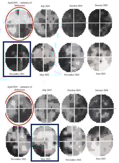 Evolution of 10-2 Humphrey VF from initiation of Idebenone (top: right eye, bottom: left eye). Initially, there was a decline in visual fields, but, after approximately 30 months of therapy (November 2021), there was a noticeable improvement in the central scotomas of the left eye. The improvement was noticed later (May 2022) in the right eye. (red circles—the moment of Idebenone initiation, black rectangles—the moment of improvement of visual fields).
