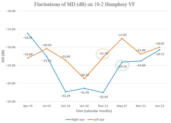 Evolution of MD (mean deviation) values on 24-2 Humphrey VF for patient number four.