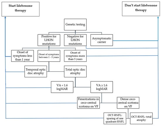 Suggested guideline for selecting the patients with indication for Idebenone administration (VA: visual acuity, VF: visual field, OCT: optical coherence tomography, RNFL: retinal nerve fiber layer).