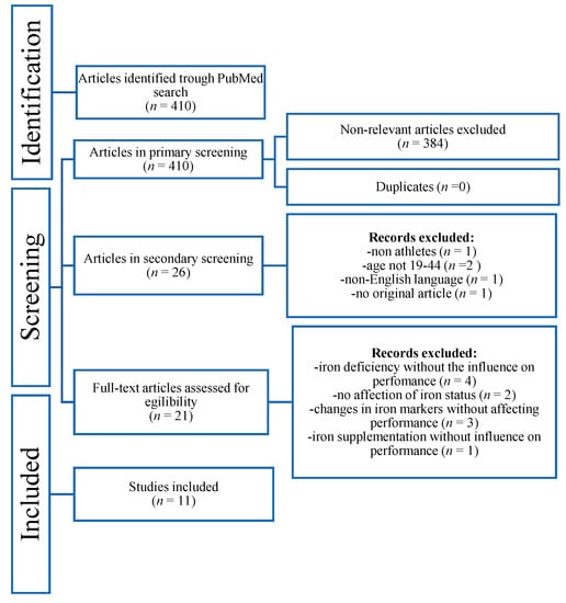 A structured literature search was performed using the PubMed database. The following terms were included in the search: “Hemoglobins” or “Iron” or “Iron Deficiencies” or “Hepcidins” or “Ferritins” or “Transferrins” or “Hemoglobin”, AND Athletes or “Athletic performance”. The algorithm for the complete advanced search performed in PubMed is presented in the Supplementary Materials. The search was limited to the last 10 years (2013–2023), and to younger athletes aged 19–44 years old. Out of the advanced search, 410 articles were reviewed for selection, based on title and abstract. The following inclusion criteria were applied: