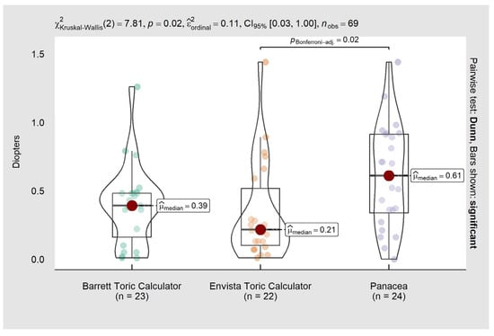 We performed a subanalysis for WTR astigmatism that indicated statistically significant differences (p-value 0.020). In the pairwise comparison, there were differences between the enVista (median = 0.21) and Panacea (median = 0.61) calculators (Figure 2). It was not feasible to perform a subanalysis for ATR and oblique astigmatism due to the small number of patients in each subgroup.