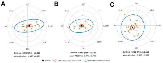 The RA prediction error centroid was similar for the Barrett and enVista toric calculators, and both were lower compared to the Panacea calculator (x-component p < 0.001; y-component p = 0.290). The RA prediction error centroid was ATR-oriented with the Barret calculator and WTR-oriented with the enVista and Panacea calculators (Figure 3).