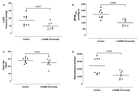 Effect of the chronic treatment with L-NAME on the left ventricular pressure (LVDP), maximal rate of rise of left ventricular pressure (dP/dtmax), heart rate, and rate pressure product (RPP). The animals were treated with L-NAME (20 mg/day for 4–6 weeks), and the hearts isolated and perfused in vitro (Langendorff’s preparation). The hearts obtained from chronically L-NAME-treated animals presented significantly lower left ventricular developed pressure (Panel A), lower maximal rate of rise of left ventricular pressure (dP/dtmax; Panel B), lower heart rate (Panel C), and lower rate-pressure product (Panel D), compared to hearts obtained from control animals. Unpaired t-test.