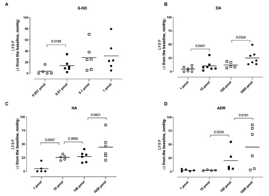 Following an equilibration period of at least ten minutes, a single bolus (10 mL) of 6-ND (0.01, 0.1, 1 or 10 pmol), dopamine (1, 10, 100 or 1000 pmol), noradrenaline (1, 10, 100 or 1000 pmol), or adrenaline (1, 10, 100 or 1000 pmol) was injected. One heart was used for a single drug and for a single dose (for the evaluation of the inotropic effect of 0.01 (n = 5), 0.1 (n = 6), 1 (n = 6), and 10 (n = 6) pmol of 6-ND, 23 animals were employed).