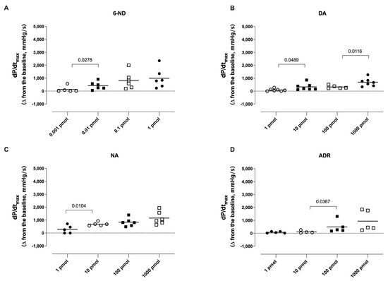 A bolus injection of 6-ND (0.01 pmol) caused a significant increase in the dP/dtmax (Figure 4A). Further increases in the doses of 6-ND also substantially increased dP/dtmax, but these increases were not significantly different among them (Figure 4A). In contrast to 6-ND, bolus injections (1 pmol) of dopamine (Figure 4B), noradrenaline (Figure 4C), and adrenaline (Figure 4D) caused no increases in the dP/dtmax. Bolus injections of higher doses of dopamine (Figure 4B), noradrenaline (Figure 4C), and adrenaline (Figure 4D) caused significant dose-dependent increases in the dP/dtmax.