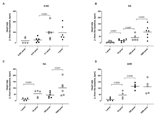 A bolus injection of 6-ND (0.1 pmol) caused a significant increase in the heart rate (Figure 5A). Further increases in the doses of 6-ND also substantially increased the heart rate, but these increases were not significantly different among them (Figure 5A). In contrast to 6-ND, bolus injections (1 pmol) of dopamine (Figure 5B), noradrenaline (Figure 5C), and adrenaline (Figure 5D) caused no increases in the heart rate. Bolus injections of higher doses (10-1000 pmol) of dopamine (Figure 5B), noradrenaline (Figure 5C), and adrenaline (Figure 5D) caused significant dose-dependent increases in the heart rate.