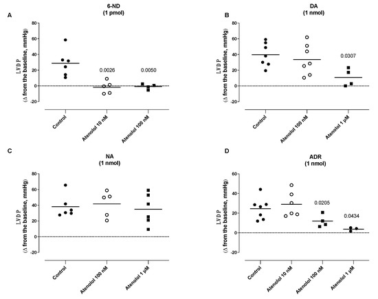 Effect of atenolol infusions (0.01–1 µM) on the increases in the left ventricle developed pressure (LVDP) induced by 6-nitrodopamine (6-ND), dopamine (DA), noradrenaline (NA), and adrenaline (ADR). Atenolol (10–100 nM) blocked the increases in the LVDP induced by 6-ND (1 pmol; Panel A). Atenolol (100 nM) had no effect on the increases in the LVDP induced by dopamine (1 nmol; Panel B) and noradrenaline (1 nmol; Panel C), but significantly inhibited the increases in the LVDP induced by adrenaline (1 nmol; Panel D). Atenolol (1 µM) significantly reduced the increases in the LVDP induced by dopamine (1 nmol; Panel B), noradrenaline (1 nmol; Panel C), and adrenaline (1 nmol; Panel D). ANOVA, followed by Newman–Keuls test. The p values reflect significance compared to control values.