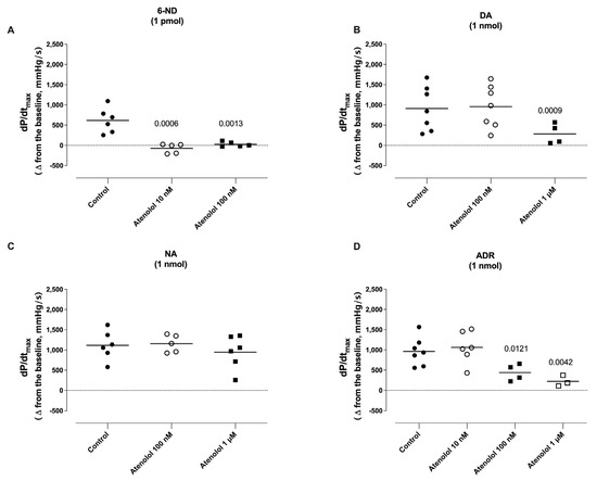 The infusion of atenolol (10 nM and 100 nM) almost abolished the increases in the dP/dtmax induced by 1 pmol of 6-ND (Figure 7A). The infusion of atenolol (100 nM) significantly reduced the increases in the dP/dtmax induced by adrenaline (1 nmol; Figure 7D), without affecting those induced by either dopamine (1 nmol; Figure 7B) or noradrenaline (Figure 7C). The infusion of atenolol (1 µM) significantly reduced the increases in the dP/dtmax induced by dopamine (1 nmol; Figure 7B), noradrenaline (1 nmol; Figure 7C), and adrenaline (1 nmol; Figure 7D).
