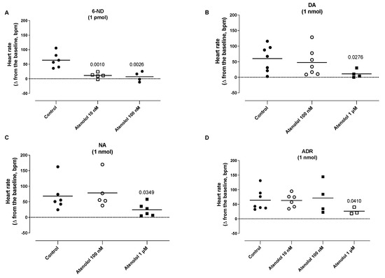 The infusion of atenolol (10 nM and 100 nM) significantly attenuated the increases in the heart rate induced by 1 pmol of 6-ND (Figure 8A). The infusion of atenolol (100 nM) did not alter the increases in the HR induced by dopamine (1 nmol; Figure 8B), noradrenaline (1 nmol; Figure 8C), and adrenaline (Figure 8D). The infusion of atenolol (1 µM) attenuated the increases in the heart rate induced by dopamine (1 nmol; Figure 8B), noradrenaline (1 nmol; Figure 8C), and adrenaline (Figure 8D).