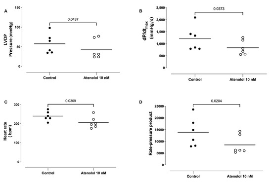 The infusion of atenolol (10 nM) caused significant reductions in the LVDP (Figure 9A), the dP/dtmax (Figure 9B), the basal heart rate (Figure 9C), and the basal rate pressure product (Figure 9D).