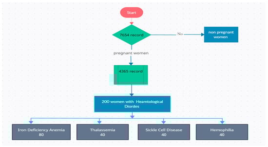 The study included a sample of 200 pregnant women who received antenatal care and delivered at the selected tertiary care hospital. The total number of 4365 records was assessed (Figure 1). The inclusion criteria comprised pregnant women diagnosed with specific hematological disorders during pregnancy. The specified hematological disorders of interest were as follows: