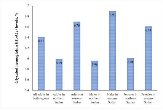 Glycated hemoglobin (HbA1c) levels among adults (males and females) in northern and eastern Sudan.