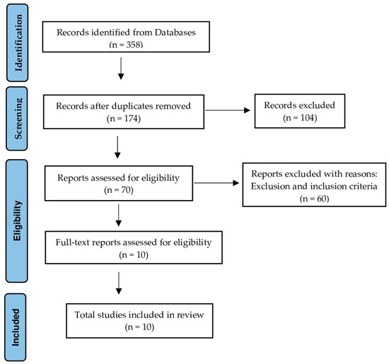 After carrying out the search in the different databases with the aforementioned strategy and adding the temporal filter from 2013 to 2023, a total of 358 documents have been obtained. Of this total, 184 studies have been eliminated due to being duplicates, leaving 174 documents. After reading the title and abstract, 104 studies were eliminated since they were interventions other than those proposed in our objectives, leaving us with 70 documents. Of these, 60 were excluded after reading the full text according to the inclusion and exclusion criteria, finally leaving us with a total of 10 articles.