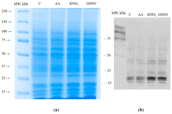 Experimental detection of S-nitrosylated proteins was performed in the water-soluble protein fractions of wheat roots after a 3 h incubation in solutions of 1 µM AA and 1 mM KNO2. Roots incubated in 5 mM GSNO were used as a positive control. Determination of the protein concentrations in the obtained isolates revealed extraction yields in the range of 0.201–0.242 mg/μL. In all samples, 30 µg of protein was applied to the lane (Figure 1).