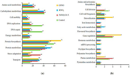 An analysis of the group-specific changes in the root proteome revealed 35 unique proteins in the roots treated with antimycin A, 14 proteins in the roots treated with KNO2, and 44 proteins in the roots treated with GSNO (Figure 2a).