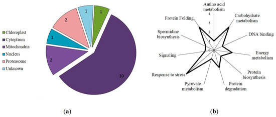 Functional annotation of the total protein number identified in all groups with the UNIPROT database and its classification categories showed that most of the proteins are responsible for protein biosynthesis and metabolism, transport, and carbohydrate metabolism (Figure S2 and Table S5). In particular, identified polypeptides included those involved in protein metabolism (40S and 60S ribosome subunits, ATP synthase, and 26S proteasome subunits), protein biosynthesis initiation and elongation factors, heat shock protein (70 kDa), and core histones. In all samples, the proteins were predominantly localized in the cytoplasm, nucleus, mitochondria, and chloroplasts (Figure 2b and Table S6).