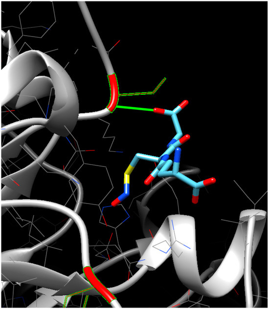 Protein models were constructed in AlphaFold (alphafold.ebi.ac.uk/ accessed on 20 August 2022), and the quality of the constructed models assessed using Procheck, GSNO (ZINC3872731) was selected as a ligand from the ZINC database (zinc.docking.org/ accessed on 1 September 2022). Molecular interactions were predicted using the SwissDock web service (www.swissdock.ch/docking accessed on 10 September 2022), and then the data were analyzed using Chimera 1.14.