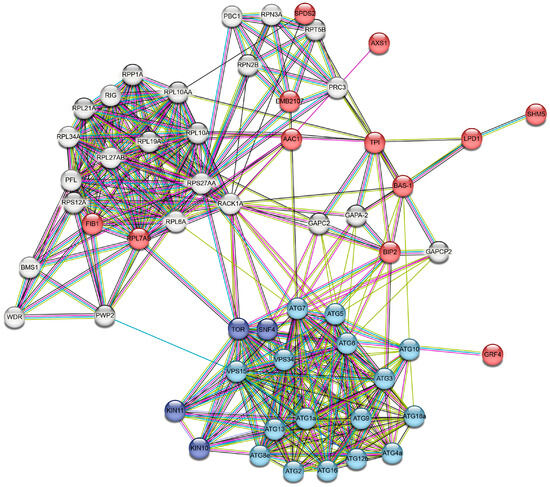 To assess possible involvement of the proteins identified with nanoLC-MS/MS and containing prospective S-nitrosylation sites (Section 3.2) in the autophagy, PPI networks were constructed using the STRING online service. For this, we added to the list of identified proteins several autophagic (ATG) proteins involved in four different stages of autophagosome formation: ATG8-conjugation system (ATG8, ATG4, ATG7, and ATG3); ATG12-conjugation system (ATG12, ATG7, ATG10, ATG5, and ATG16); ATG1 protein kinase complex (ATG1, ATG13, ATG17, and ATG29); Vps34 PI3 kinase complex (Vps34, Vps15, ATG14, ATG6, and ATG9); and ATG2-ATG18 complex (ATG2, ATG18, and ATG9). Moreover, we added to this list two further proteins’ target of rapamycin (TOR) kinase and SNF1-related kinase (SnRK1), which are the negative and positive regulators of autophagic processes. To link the proteins identified in this study with the ATG proteins, 13 predicted functional partners proposed with the STRING program were also introduced (Table 2). A network analysis demonstrated that selected proteins have more interactions with each other than could be expected for a random set of proteins. This enrichment indicates that the proteins are potentially biologically related (p = 13 × 10−10). From an expected number of 364 edges, the number of nodes is 56 (avg. local clustering coefficient is 0.775).