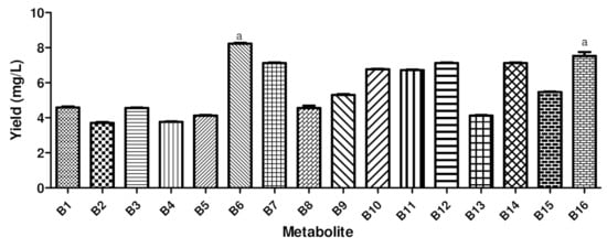 The fractions of the final yield of the extracted bioactive substances (in mg) were analyzed to quantify the metabolites extracted from the liquid medium via liquid–liquid separation. We concluded that obtaining a desirable quantity of metabolites using this simple and cheap technique is feasible, since the promising samples produced final yields of 8.2 mg/L (B6), 4.3 mg/L (B8), 5.6 mg/L (B11), 4.1 mg/L (B13), 7.1 mg/L (B14), 5.5 mg/L (B15), and 7.7 mg/L (B16) (Figure 1). When the yields obtained from different microorganisms were compared, a statistically significant difference was observed in the metabolites produced by bacteria B6 and B16.