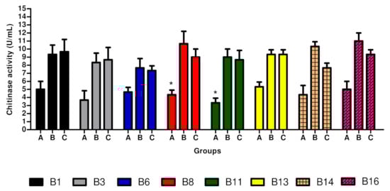 The use of the dried F. oxysporum for chitinase production was studied (Figure 3). Sixteen bacterial strains were tested for chitinase production. Isolates with the potential to degrade chitin were selected. Of these, eight bacterial isolates (B1, B3, B6, B8, B11, B13, B14, and B16) produced chitinases, as evidenced by the formation of a halo in the culture medium. These eight strains produced chitinase under the three tested conditions; in particular, B8 exhibited chitinase activity of ±11 U/mL. Enzyme production decreased when the strain was grown in the CYS medium, in which colloidal chitin was replaced by dry fungal mats as a source of chitin for all bacteria tested. A slight increase in chitinase production was observed in the CYS medium amended with dried fungal mats.