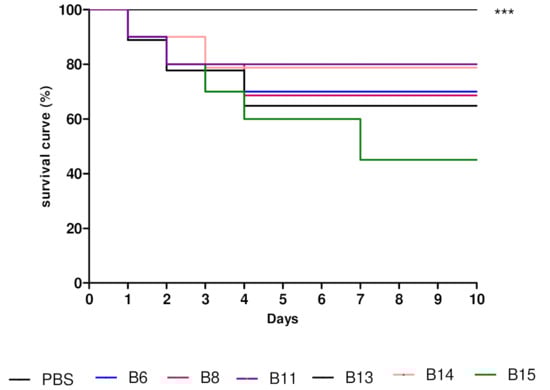 Using the alternative model (T. molitor) to evaluate toxicity produced a survival curve for the larvae over 10 d (Figure 4); this curve suggests that the secondary metabolites produced by B. humi (B11) exhibit good efficacy and low acute toxicity. The metabolites produced by M. yunnanensis (B06) and S. marcescens (B8) exhibited medium to moderate toxicity (Figure 4).