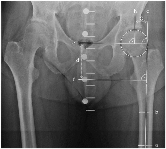 Plain anterior–posterior radiographs of the pelvis visualizing leg length and femoral offset measurements. Two parallel bisections of the femoral shaft (a, b) determined the longitudinal femoral shaft axis (c). Perpendicular to (c), the leg length (d) was measured between the femoral head centre (e) and the tip of the lesser trochanter (f). The femoral offset (g) was measured between the femoral head center (h) perpendicular to (c).