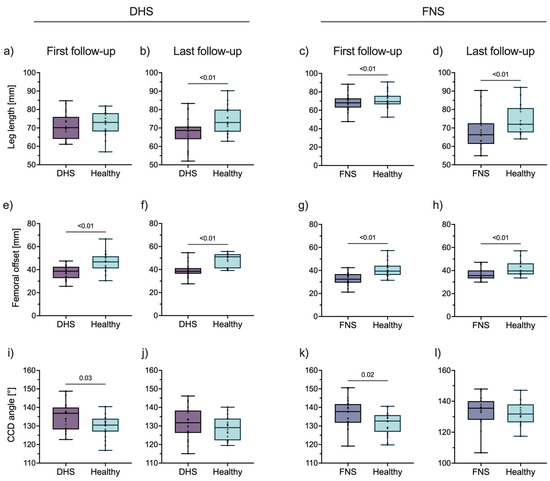 In DHS patients, femoral offset of the injured side was lower at first (injured: 37.72 mm [IQR 31.44, 41.34]; healthy: 46.74 mm [IQR 41.15, 51.69]; p < 0.01) and last follow-up (healthy: 38.69 mm [IQR 36.55, 41.56]; injured: 51.08 mm [IQR 41.05, 53.34]; p < 0.01) (Figure 2e,f). In FNS patients, femoral offset of the injured side was also lower at first (injured: 32.42 mm [IQR 29.33, 37.10]; healthy: 39.41 mm [IQR 36.10, 44.09]; p < 0.01) and last follow-up (injured: 35.21 mm [IQR 33.05, 41.36]; healthy: 39.65 mm [IQR 36.68, 46.21]; p < 0.01) (Figure 2g,h). Differences in femoral offset were stable over time in both groups (DHS: −9.60 mm [IQR −14.97, −4.86] to −12.27 mm [IQR −13.19, −3.88], p = 0.89; FNS: −6.86 mm [IQR −9.62, −2.73] to −5.63 mm [IQR −7.64, −1.46], p = 0.27).