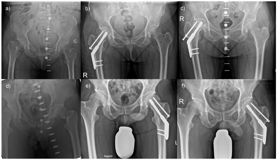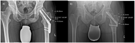 We assessed radiographic parameters in plain anterior–posterior radiographs of the pelvis using the MERLIN Diagnostic Workcenter (MERLIN Diagnostic Workcenter for Microsoft Windows, Version 5.8.1, Phönix-PACS GmbH, Freiburg im Breisgau, Germany). As previously described, Pauwels and centrum–collum–diaphyseal (CCD) angles were measured in the last preoperative and first postoperative radiographs [20]. Also, CCD angles, femoral offset, and leg length were evaluated using the earliest postoperative and follow-up radiographs at six months (Figure 1).