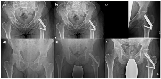 Outcomes of femoral neck fractures when treated with a DHS with anti-rotational screw: (a) A 57-year-old female patient presented with a highly unstable femoral neck fracture, (b) which was treated with a DHS with an anti-rotational screw, but (c) developed an avascular necrosis of her hip. In comparison, (d) a 40-year-old male patient presented with a comparable fracture morphology, (e) underwent analogous treatment, and (f) demonstrated favorable postoperative results.