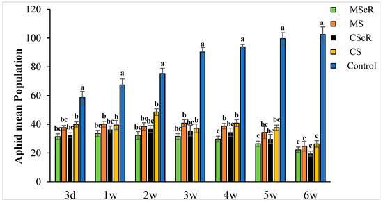 The average number (±SE) per plant of aphids in a cucumber greenhouse at different time intervals: The green bar represents MScR, light brown represents MS, black shows CScR, yellow indicates CS, and blue represents control. The mean population of Myzus persicae in cucumber greenhouses with the presence of natural enemies and floral plants (Coriandrum sativum) and natural enemies without floral plants MScR = M. sexmaculatus + C. sativum; MS = M. sexmaculatus; CScR = C. septempunctata + C. sativum; CS = C. septempunctata at different D = days and W = weeks of observation. Different letters indicate statistically significant differences between treatments. ANOVAs with Tukey HSD post hoc tests were used to compare treatments.