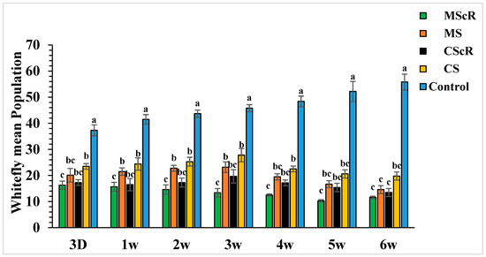The average number (±SE) per plant of whitefly in a cucumber greenhouse at different time intervals: The green bar represents MScR, light brown represents MS, black shows CScR, yellow indicates CS, and blue represents control. The mean population of Bamisia tabaci in cucumber greenhouses with the presence of natural enemies and floral plants (Coriandrum sativum) and natural enemies without floral plants MScR = M. sexmaculatus + C. sativum; MS = M. sexmaculatus; CScR = C. septempunctata + C. sativum; CS = C. septempunctata at different D = days and W = weeks of observation. Different letters indicate statistically significant differences between treatments. ANOVAs with Tukey HSD post hoc tests were used to compare treatments.