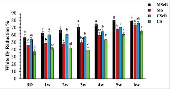 Population reduction in whiteflies in cucumber greenhouses at different time intervals: the aphid population decreased significantly with the passage of time. The black bar represents MScR, red represents MS, the light blue colour shows CScR, and the green colour represents CS. The reduction in Bemisia tabaci in the cucumber greenhouse with the presence of natural enemies and floral plants (Coriandrum sativum) and natural enemies without floral plants MScR = M. sexmaculatus + C. sativum; MS = M. sexmaculatus; CScR = C. septempunctata + C. sativum; CS = C. septempunctata at different D = days and W = weeks of observation. The reduction percentage in aphid and whitefly was determined using Abbott’s formula. Different letters indicate statistically significant differences between treatments. ANOVAs with Tukey HSD post hoc tests were used to compare treatments.