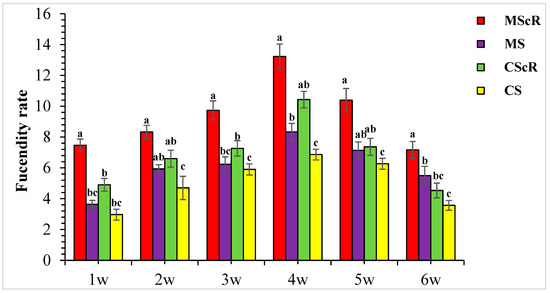 The fecundity rate of M. sexmaculatus and C. septempunctata in a cucumber greenhouse with the presence of a floral plant (Coriandrum sativum) and natural enemies without floral plants MScR = M. sexmaculatus + C. sativum, MS = M. sexmaculatus; CScR = C. septempunctata + C. sativum; CS = C. septempunctata at different times and W = weeks of observation. Shows the average eggs laid per plant. There was a significant effect between treatments; MS plots had significantly fewer eggs than MScR plots over time and a similar trend was observed between CS and CScR plots. ANOVAs with Tukey HSD post hoc tests were used to compare treatments. The different letters indicate statistically significant differences between treatments.