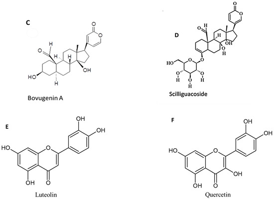 Phytochemical compounds of Bowiea volubilis, (A,B) steroids, (C,D) cardiac glycosides, and (E,F) flavonoids.