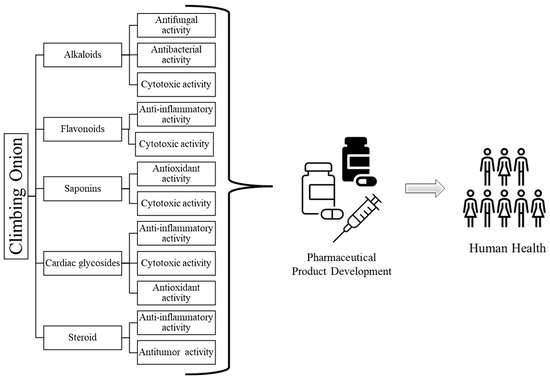 Skin conditions impact a substantial portion of the global population, ranging from 30% to 70%, making them a prevalent cause for seeking medical attention in general medical practice [102]. Over 3000 distinct skin diseases, encompassing both short-term and long-lasting forms, affect people across various age groups and social backgrounds [103]. Moreover, skin diseases can have a significant impact on quality of life due to visible symptoms, discomfort, and social stigma. Furthermore, skin disorders encompass a wide spectrum of ailments that impact the integrity, visual attributes, and operational capabilities of the skin. These afflictions can stem from genetic predispositions, environmental catalysts, immune reactions, infections, and lifestyle influences. Gaining insight into the scientific facets of skin diseases entails delving into their fundamental origins, manifestations, and intricacies [104]. In line with this, inflammation serves as a pervasive characteristic shared by numerous dermatological disorders. Conditions such as eczema, psoriasis, and acne are marked by immune reactions that precipitate inflammatory processes, giving rise to manifestations of redness, irritation, and pruritus [105]. The skin microbiome, consisting of diverse microorganisms, plays a role in skin health. The implications for wound healing and protection against potential pathogens or environmental conditions highlight the crucial role of skin homeostasis. Imbalances in the microbiome can contribute to conditions such as acne [106]. B. volubilis is reported to contain various bioactive compounds, including alkaloids, saponins, and flavonoids, that could contribute to its anti-inflammatory properties. This potential anti-inflammatory effect could have implications for managing various inflammatory skin conditions, as well as other disorders characterized by inflammation. The potential of Bowiea volubilis in combatting skin pathogens is of interest due to its reported bioactive constituents that could exhibit antimicrobial properties. These properties could make B. volubilis a candidate for addressing skin infections caused by various pathogens, including bacteria, fungi, and other microorganisms. However, it is important to note that scientific research on its effectiveness and safety for treating skin diseases is limited.
