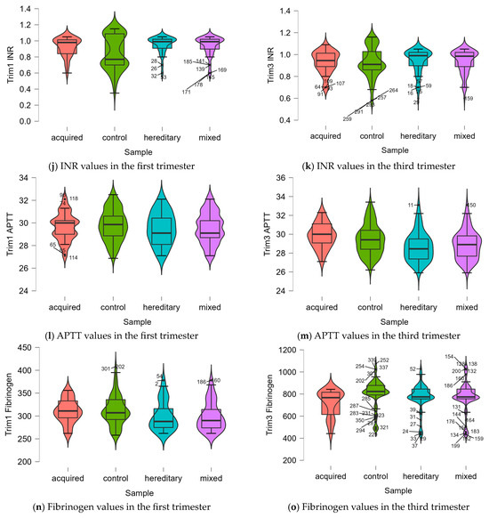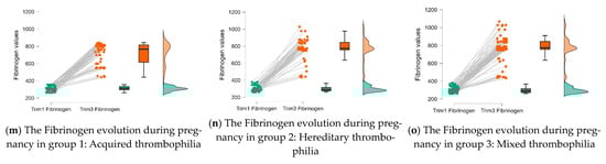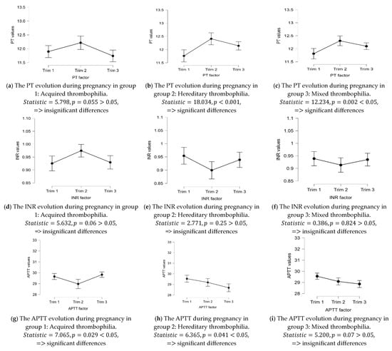 For testing the entire evolution of the pregnant women (from the 1st trimester to the 2nd one, and for the 3rd trimester), a Friedman test was applied, obtaining significant differences in most of the studied parameters, especially in the hereditary and mixed thrombophilia groups. All the results are presented in Figure 4.