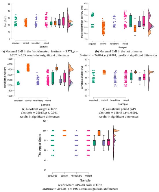 The data dynamics resulted from the Kruskal—Wallis test upon the studied groups for maternal BMI in the first and last trimester, newborn weight, gestational period, and APGAR score. The statistical significance is written below each chart.