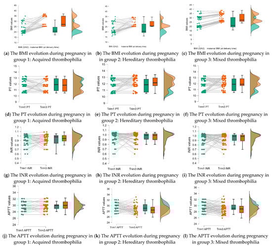 Based on the results from the Mann—Whitney test we applied a Wilcoxon Signed Rank to see the data evolution in the first and last trimester of pregnancy. A significant increase was registered in the case of the mother’s BMI and fibrinogen values, for all three groups of patients with thrombophilia; for hereditary and mixed thrombophilia, it was registered a significant decrease in PT, and in APTT only in the hereditary group (see Table 3, Figure 3).
