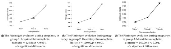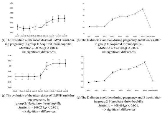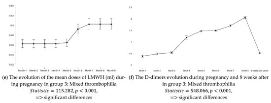For the haemostasis parameters and for the doses of LMWH, analysed between the three studied types of thrombophilia, a Kruskal—Wallis test was applied, in each of the nine-time points (one measurement monthly), obtaining insignificant differences, , for the LMWH doses and for the D-dimers levels; the same results , were obtained for PT, INR, APTT, and fibrinogen parameters measured in each pregnancy trimester. So, we can presume no different approach regarding doses of anticoagulant.