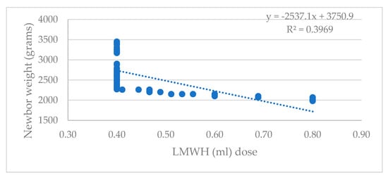 A regression model was performed to evaluate a possible correlation between the LMWH doses and the newborn weight (see Figure 6).