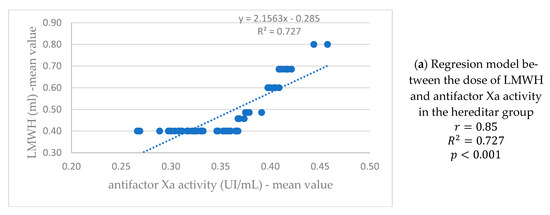 The regression model presents the dependence between the dose of LMWH (ml) and the anti-Factor Xa levels in all three samples.