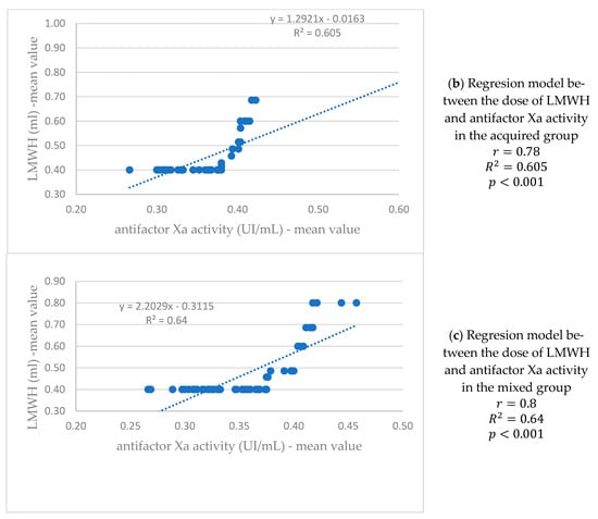 In well-resourced countries, VTE is a prominent cause of maternal death []. Thrombophilia is a condition characterized by a higher proclivity to VTE []. Anticoagulation with low molecular weight heparins is a well-established antithrombotic treatment for thromboprophylaxis during pregnancy, both primary and secondary []. LMWH dose modifications during pregnancy based on anti-factor Xa activity levels were common studies of pregnant women on LMWH for VTE prophylaxis. The mean starting dose of LMWH was 0.46 mL in the hereditary and mixed group of thrombophilia, respectively 0.44 mL in the acquired group of thrombophilia. Given our findings and those of other researchers, it seems appropriate to serially evaluate anti-Factor Xa levels in all pregnant women receiving LMWH, because the dosage response to LMWH changes throughout pregnancy. We tested the D-dimers and the anti-factor Xa levels monthly, for all the studied thrombophilia groups. Monitoring the pharmacological action of LMWH is required in certain circumstances (such as pregnant women), where anti-FXa level measurement is advised. In our study, however, the mean anti-FXa levels in pregnant women with thrombophilia were as follows: 0.35 UI/mL in the hereditary thrombophilia group and 0.36 UI/mL in the acquired and mixed thrombophilia groups. In this cohort study of pregnant women who received LMWH for prophylaxis, anti-FXa levels were used to modify LMWH doses during pregnancy; the more we decreased the doses of LMWH, the more anti-FXa levels were within the parameters.