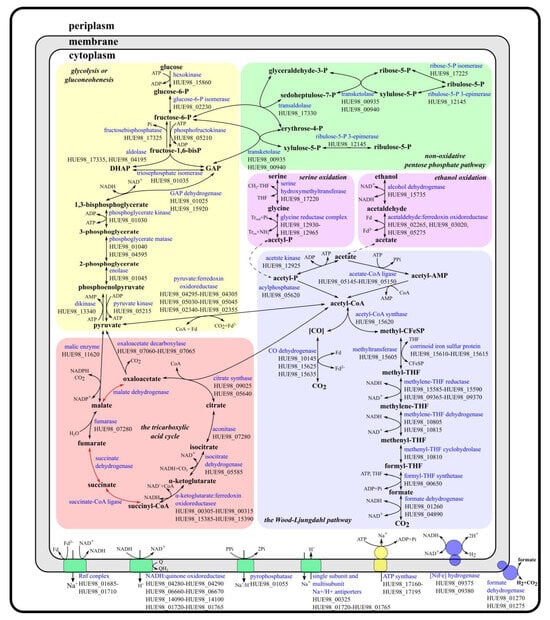 The genes for methylene-THF reductase (HUE98_09365-HUE98_09370) and carbon monoxide (HUE98_10145-HUE98_10165) dehydrogenases in ‘Ca. C. alkaliaceticus’ are multiplicated, and their copies were found in different loci. Other genes belonging to the methyl branch of the Wood–Ljungdahl pathway in ‘Ca. C. alkaliaceticus’ were scattered across the genome, away from the main gene cluster described above. These genes include formyl-THF synthetase (HUE98_00650), methenyl-THF cyclohydrolase (HUE98_10810), and methylene-THF dehydrogenase (HUE98_10805, HUE98_10815).