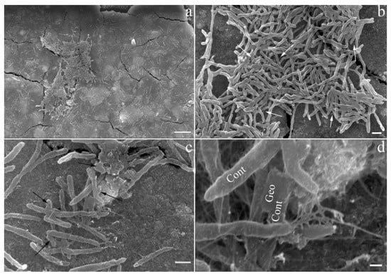 Colonization of magnetite surface by a binary culture of ‘Ca. C. alkaliaceticus’ and G. ferrihydriticus: (a,b) formation of colonies by ‘Ca. C. alkaliaceticus’ (long curved cells); (b) connection of cells and magnetite surface by pili (white arrows); (c) cells of G. ferrihydriticus (short straight cells, marked with black arrows) closely associated with putative cells of ‘Ca. C. alkaliaceticus’; (d) pili formed in the binary culture; Geo—a putative cell of G. ferrihydriticus; Cont—putative cells of ‘Ca. C. alkaliaceticus’. Bar, 10 µm (a); 1 µm (b,c); 200 nm (d).
