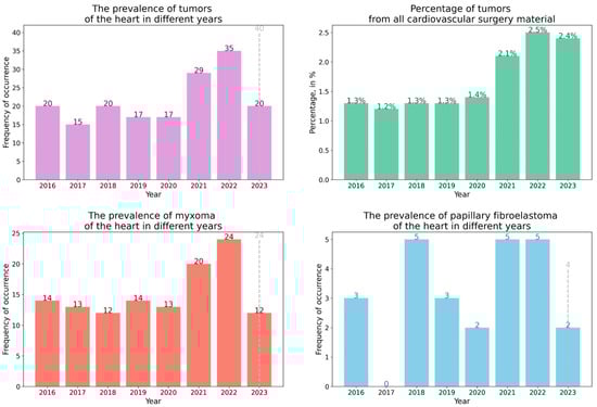 Histograms of the proportion and absolute number of heart tumors in the material of cardiovascular surgery and endomyocardial biopsies from 2016 to 2023 (%).